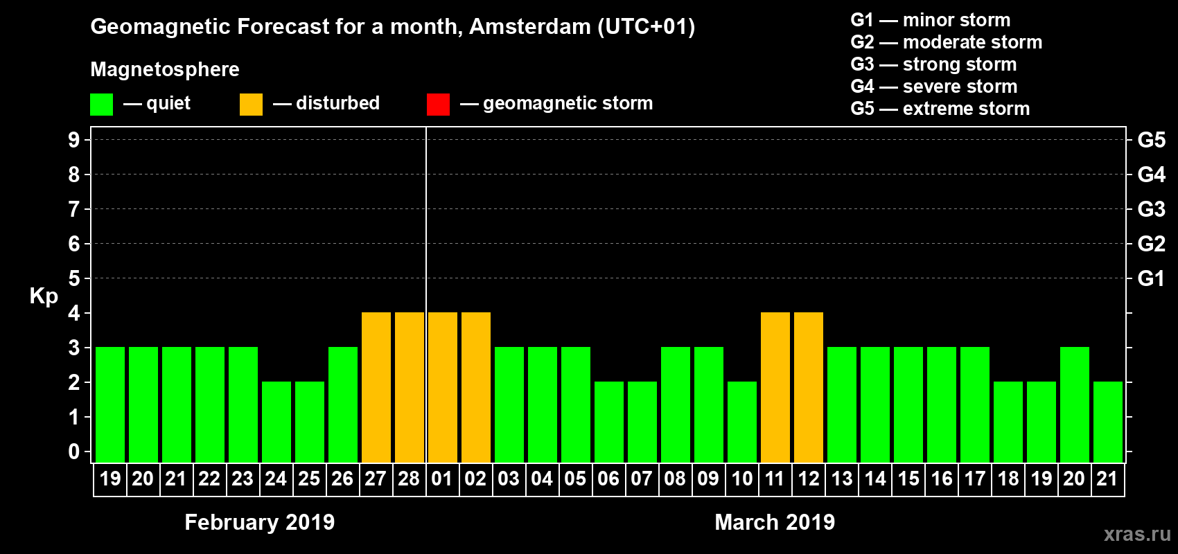 Geomagnetic activity forecast in Amsterdam — Feb 19, 2019
