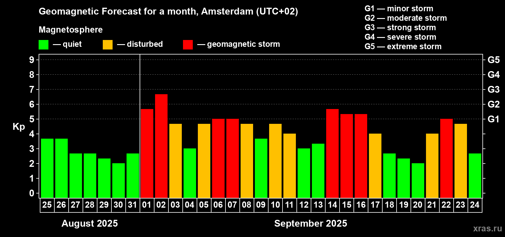 Geomagnetic storm forecast in Amsterdam for Aug 25, 2025