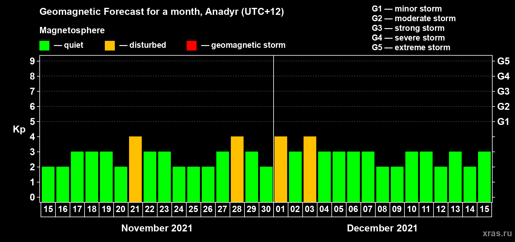 Geomagnetic storm forecast in Anadyr for Nov 15, 2021