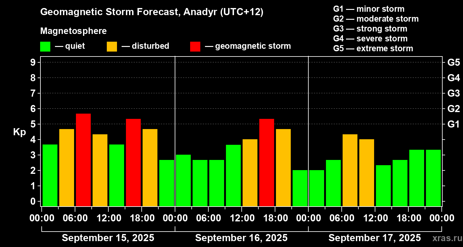 Geomagnetic storm forecast in Anadyr for Sep 15, 2025
