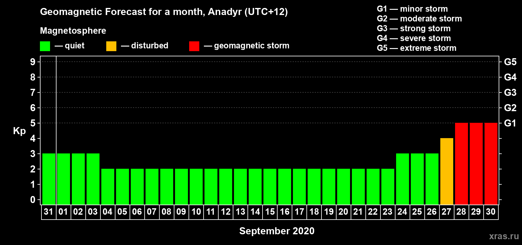 Geomagnetic storm forecast in Anadyr for Aug 31, 2020