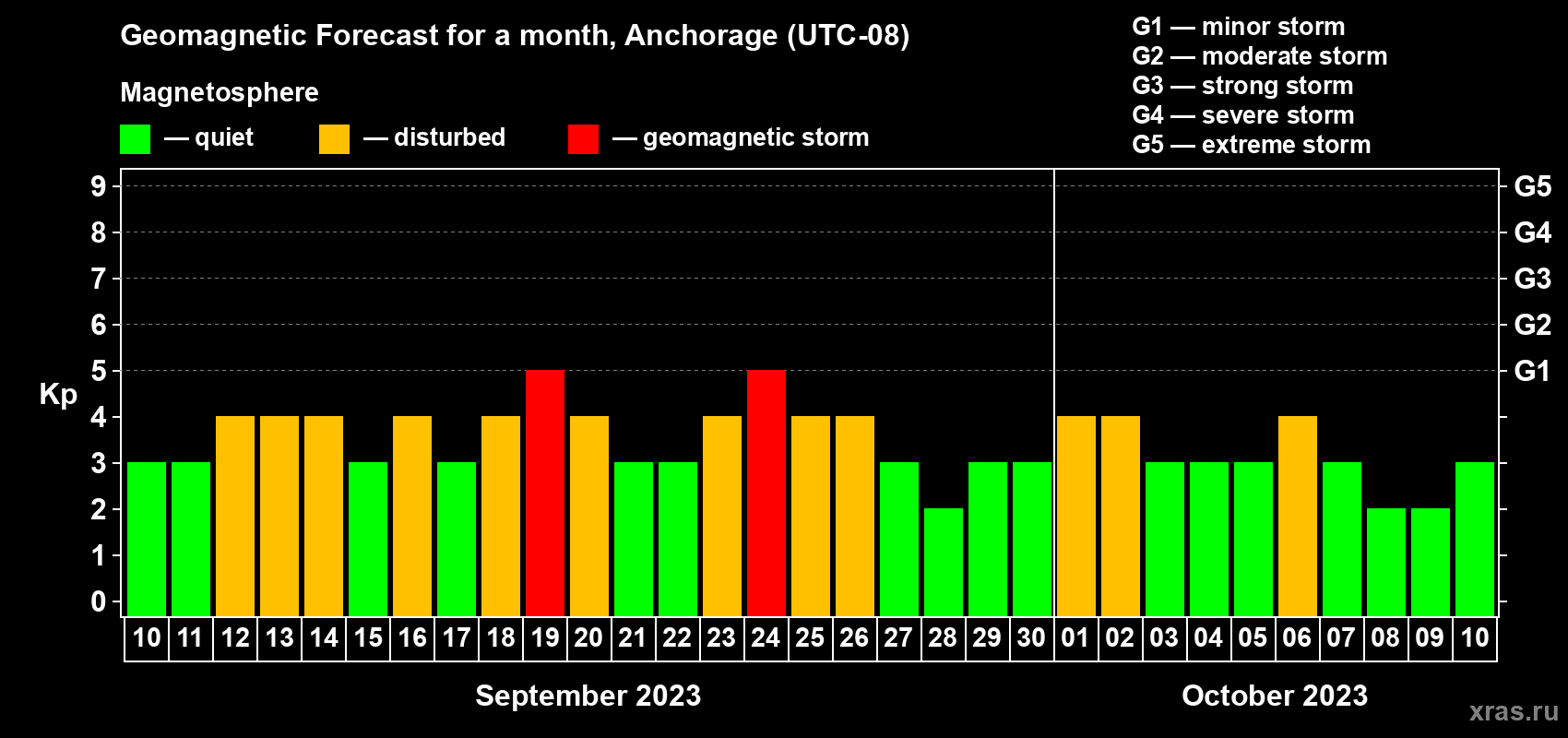 Geomagnetic storm forecast in Anchorage for Sep 10, 2023