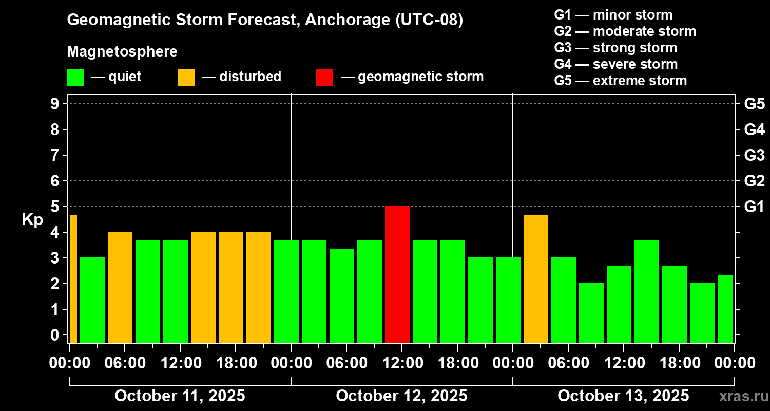 Geomagnetic storm forecast in Anchorage for Oct 11, 2025