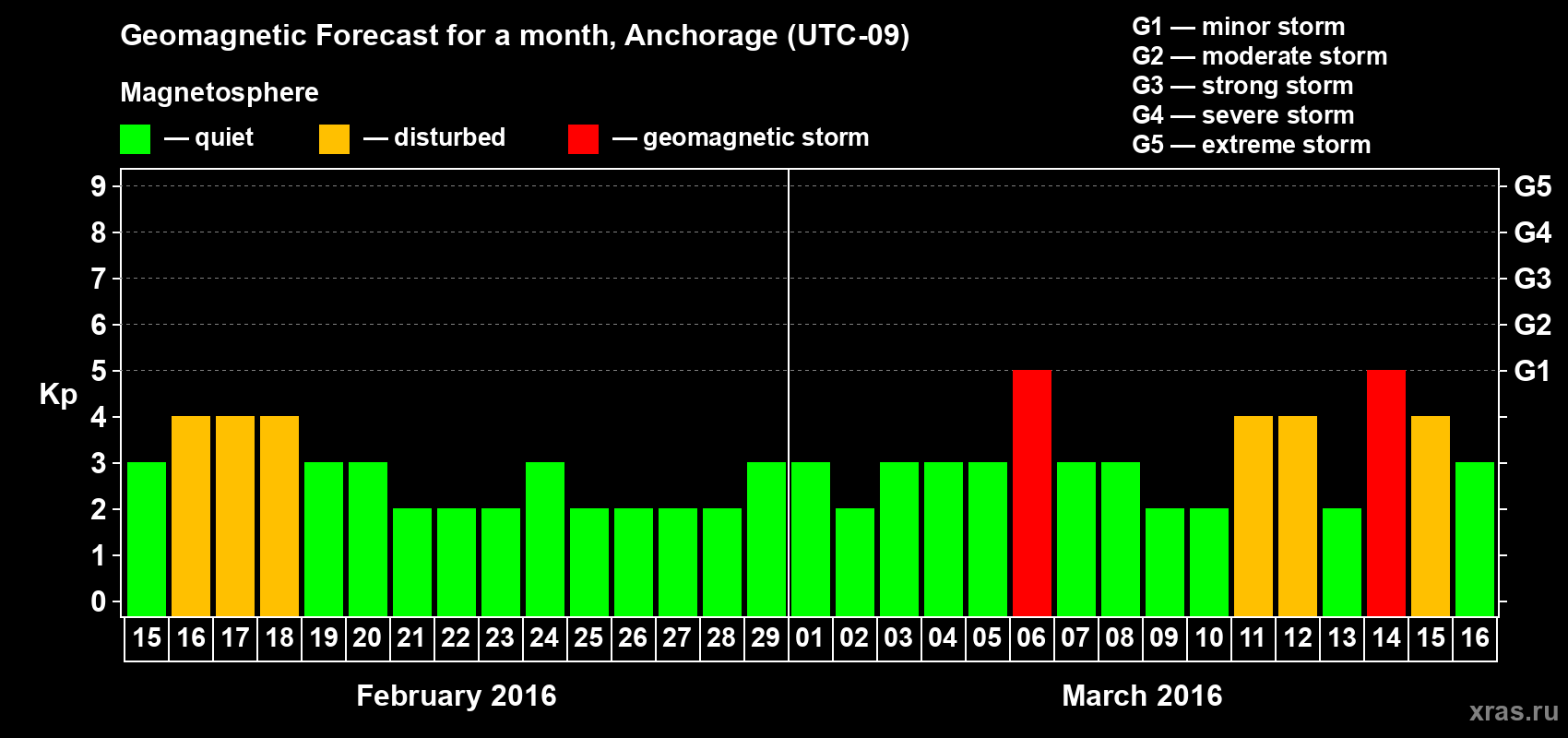 Geomagnetic storm forecast in Anchorage for Feb 15, 2016
