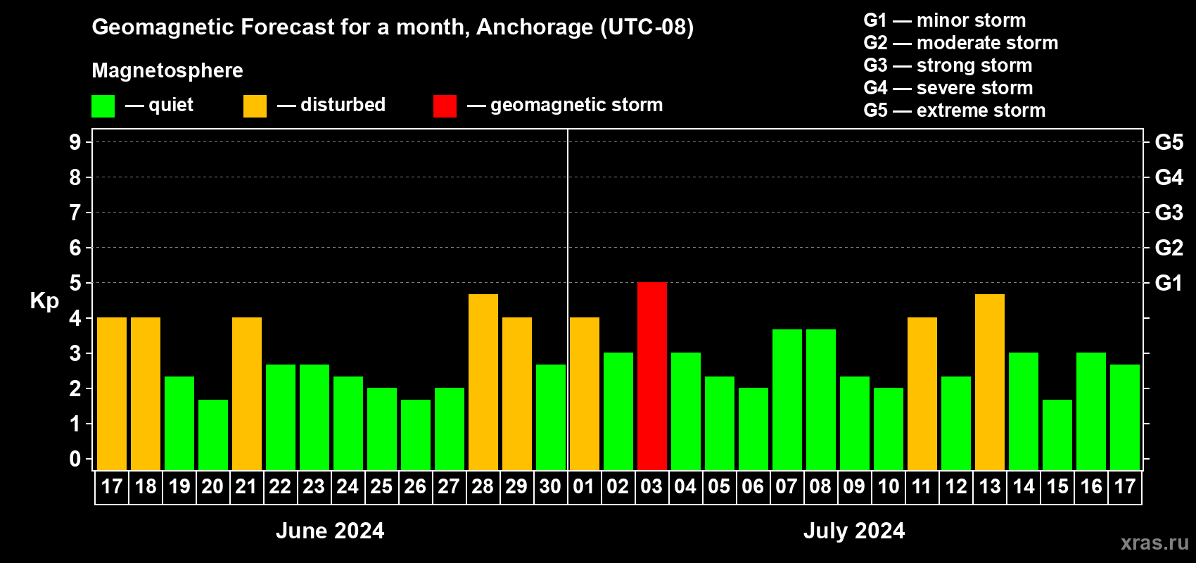 Geomagnetic storm forecast in Anchorage for Jun 17, 2024