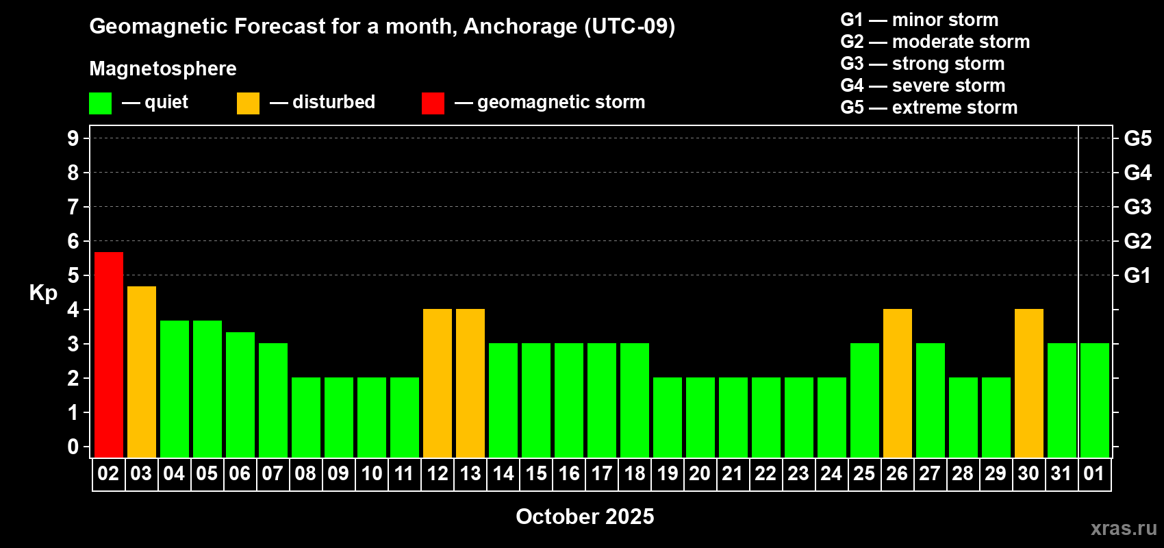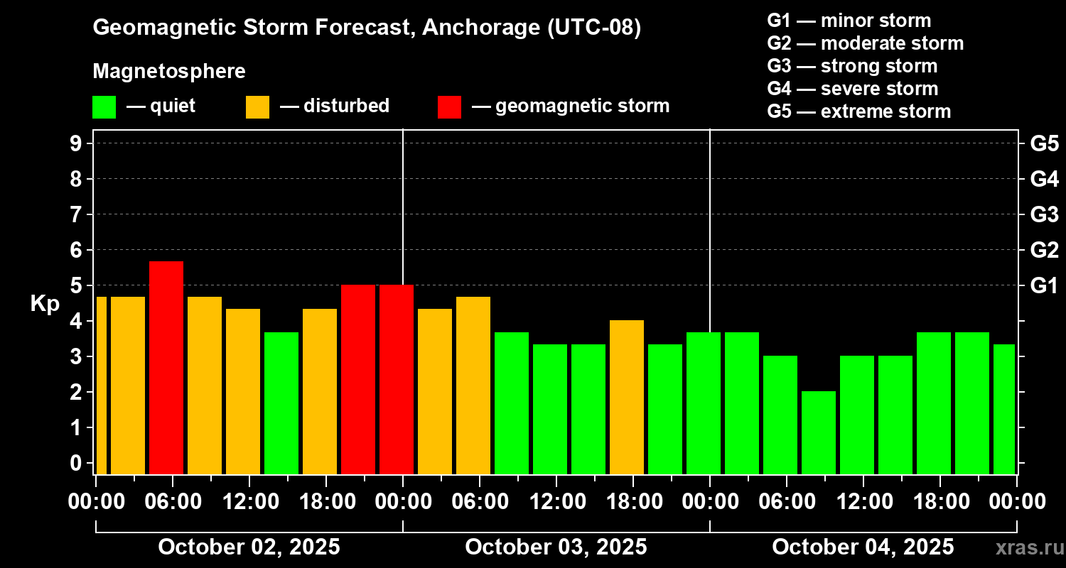 Geomagnetic storm forecast in Anchorage for Oct 02, 2025