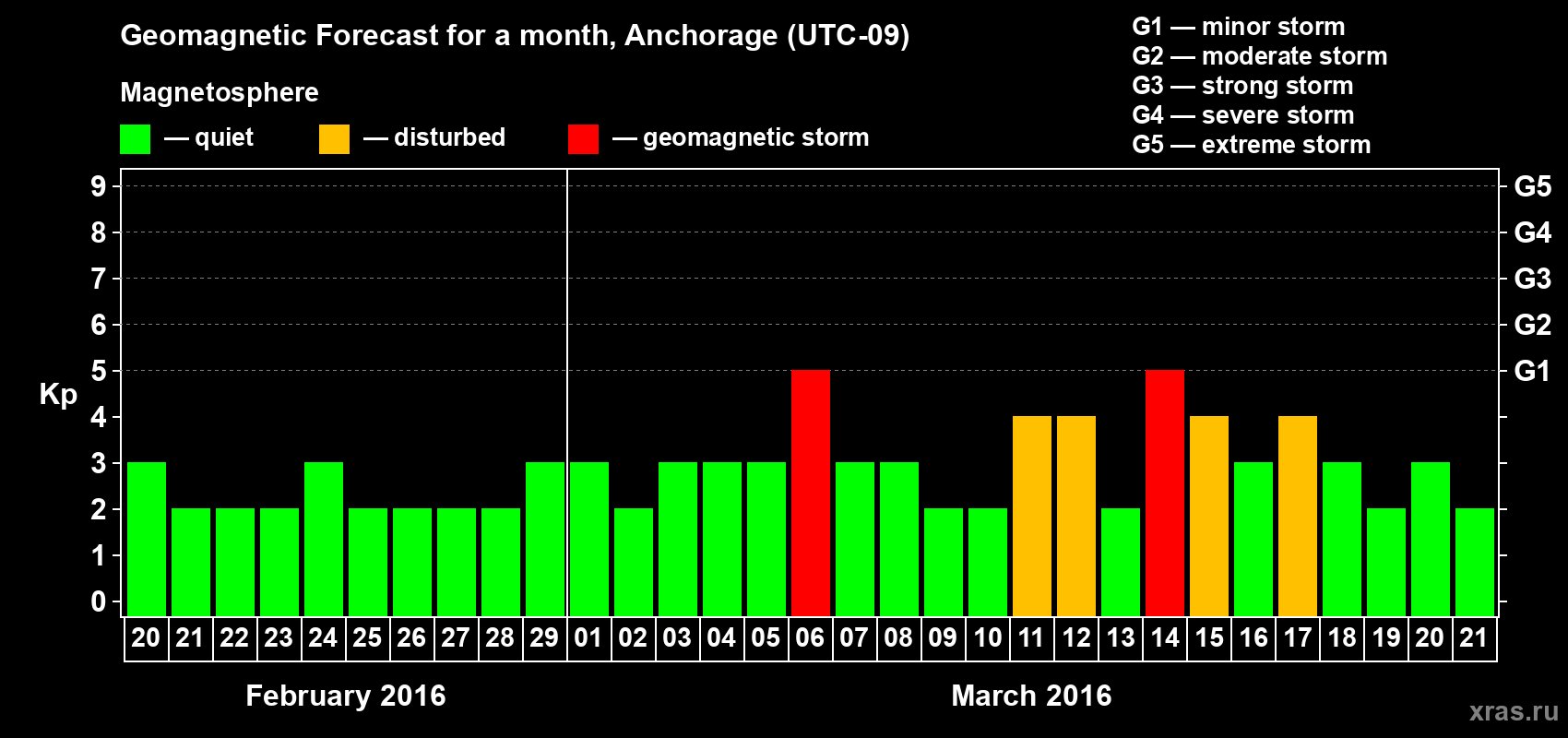 Geomagnetic storm forecast in Anchorage for Feb 20, 2016