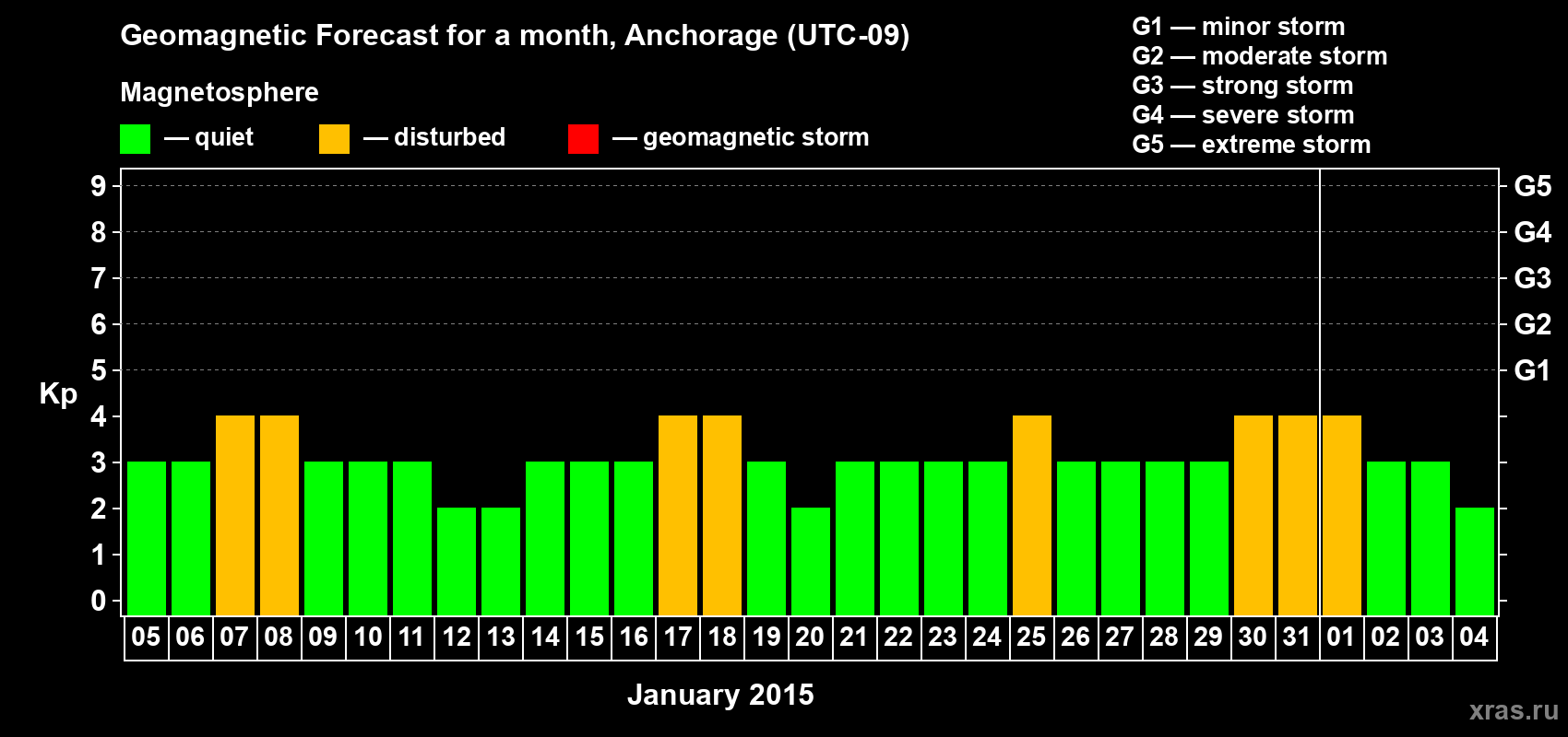 Geomagnetic storm forecast in Anchorage for Jan 05, 2015