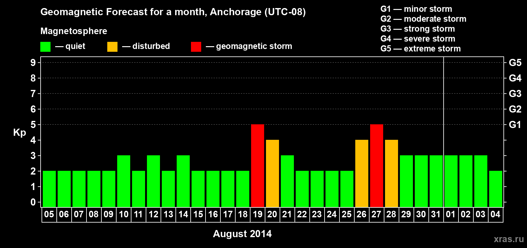 Geomagnetic storm forecast in Anchorage for Aug 05, 2014