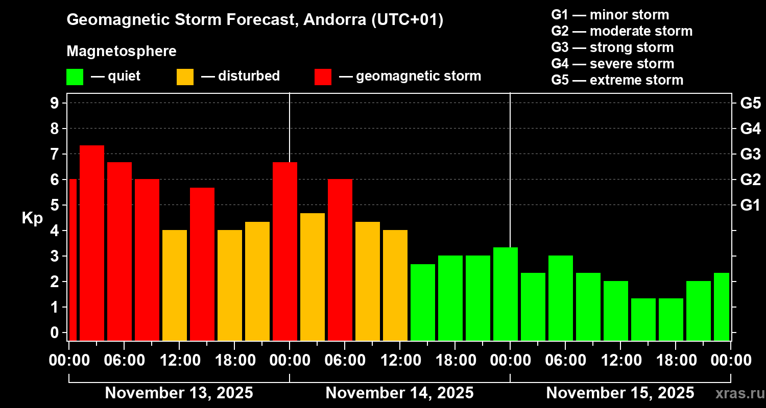 Geomagnetic storm forecast in Andorra for Nov 13, 2025