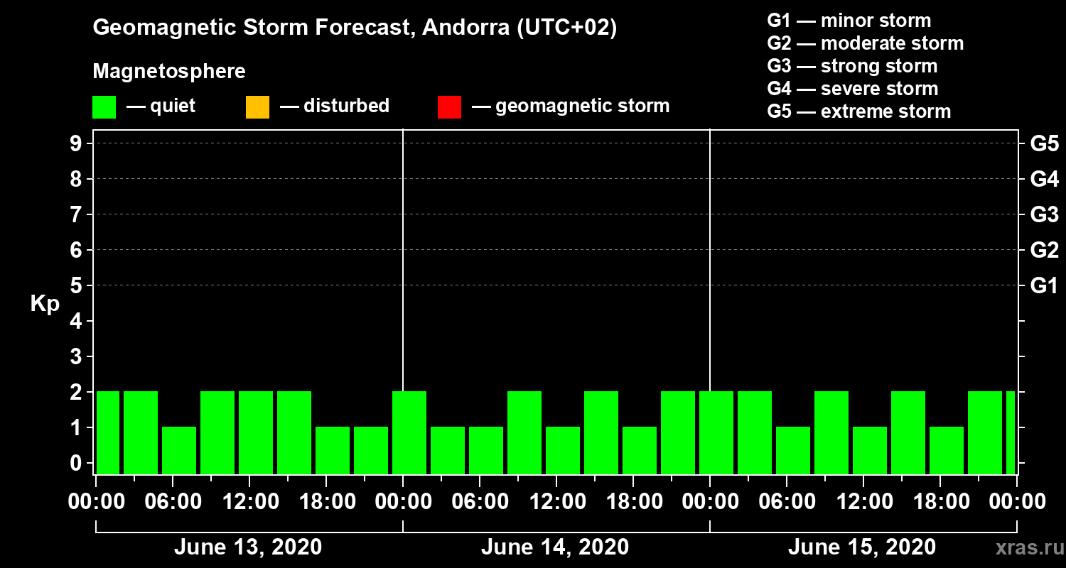 Geomagnetic storm forecast in Andorra for Jun 13, 2020
