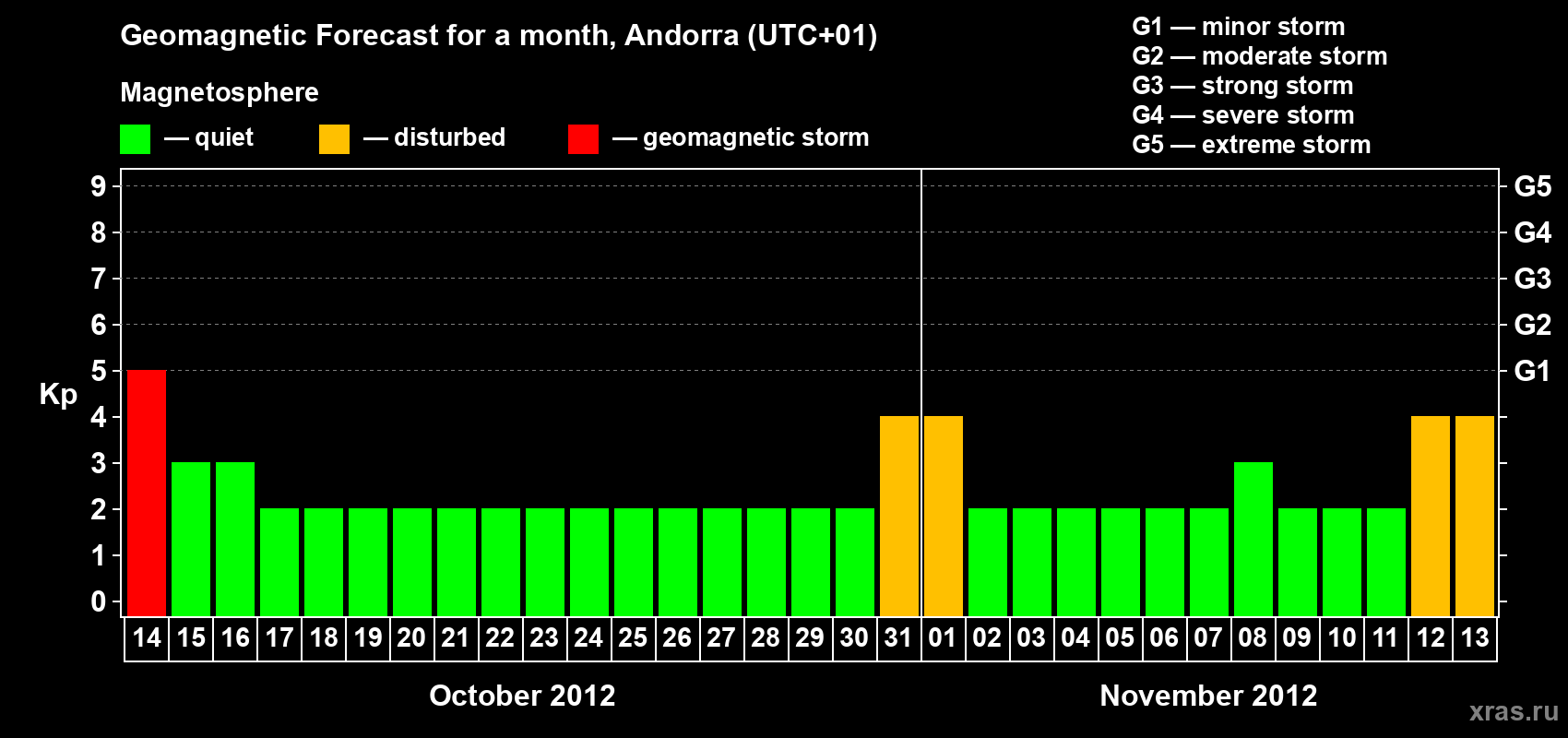 Geomagnetic storm forecast in Andorra for Oct 14, 2012