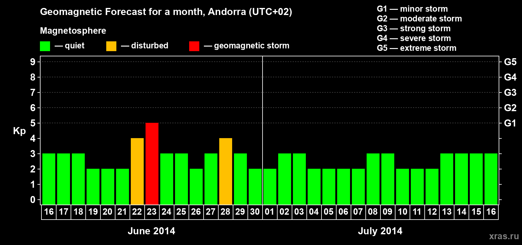 Geomagnetic storm forecast in Andorra for Jun 16, 2014