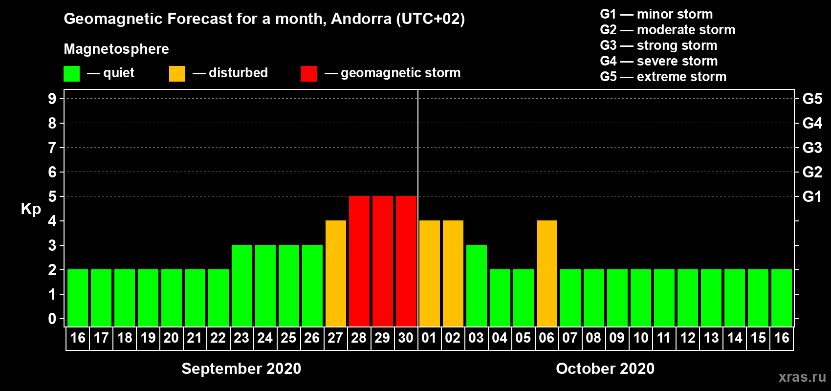 Geomagnetic storm forecast in Andorra for Sep 16, 2020