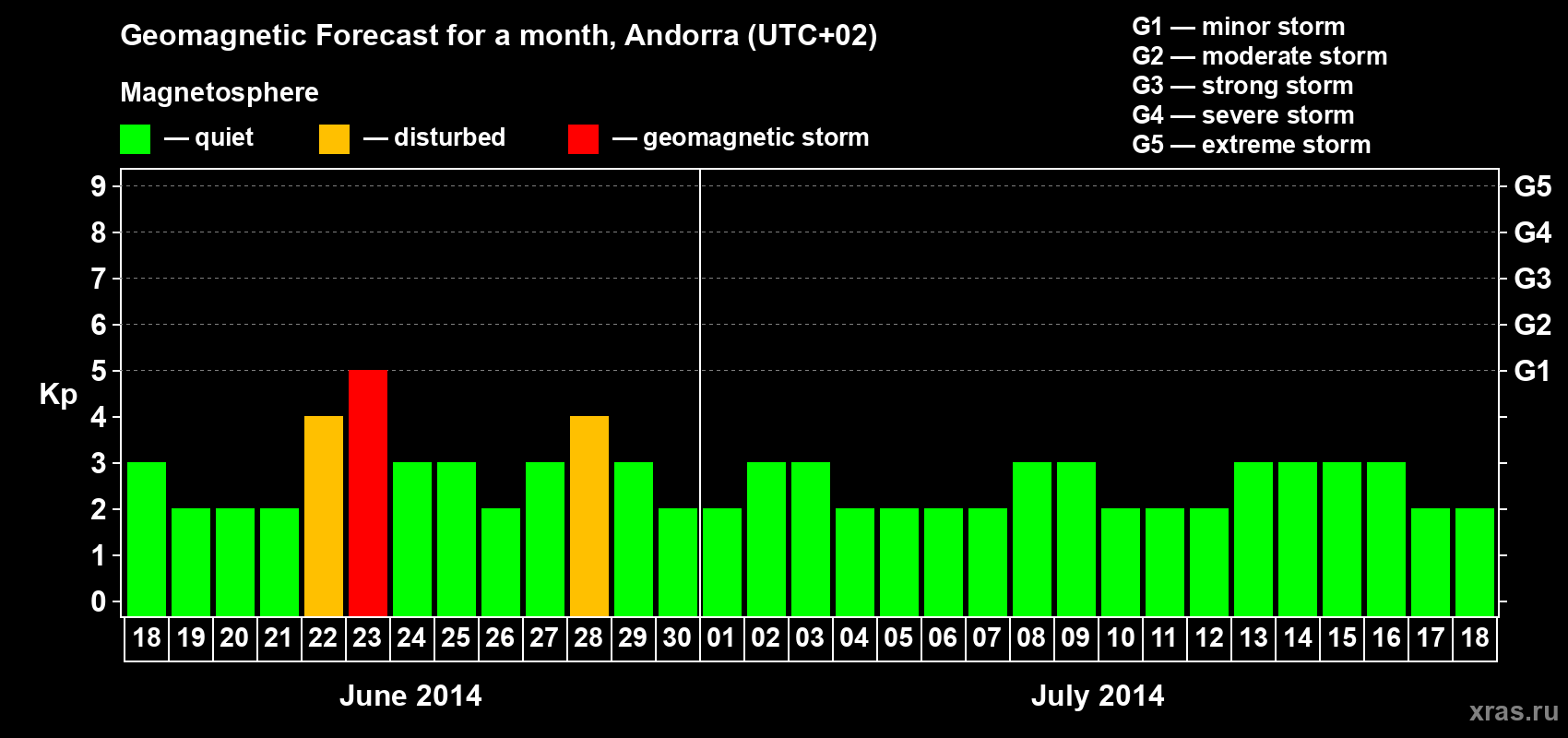 Geomagnetic storm forecast in Andorra for Jun 18, 2014