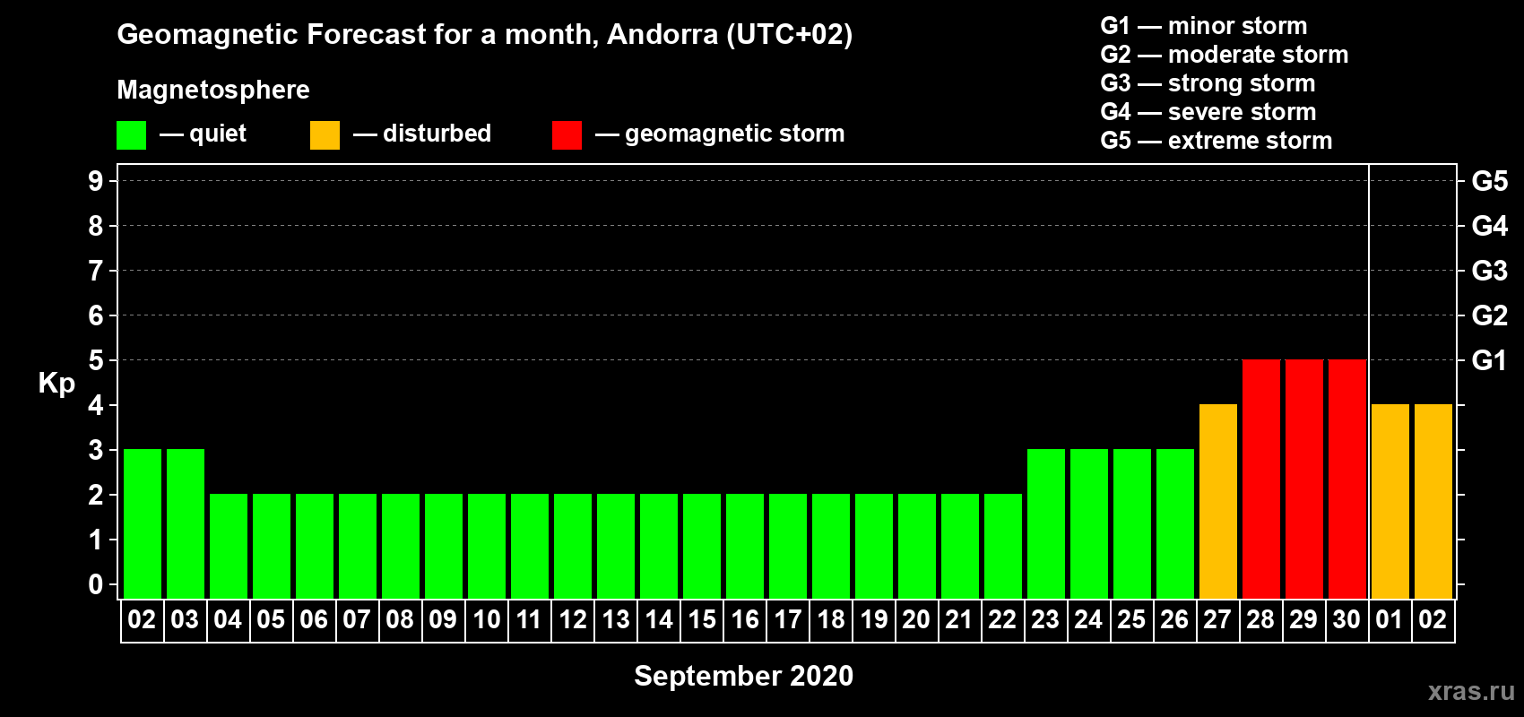 Geomagnetic storm forecast in Andorra for Sep 02, 2020