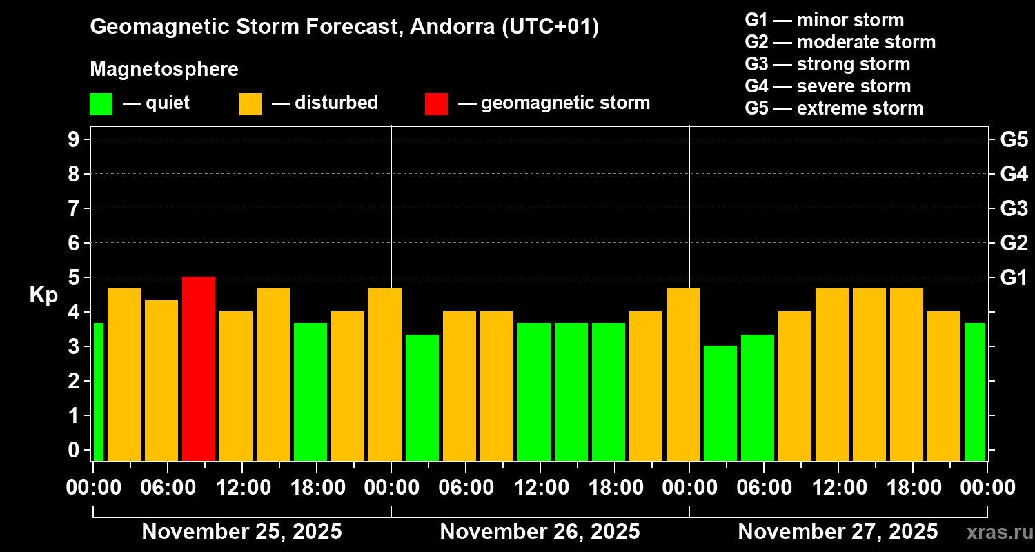 Geomagnetic storm forecast in Andorra for Nov 25, 2025
