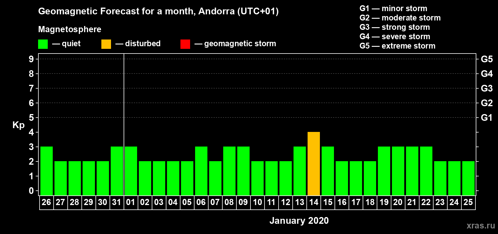 Geomagnetic storm forecast in Andorra for Dec 26, 2019