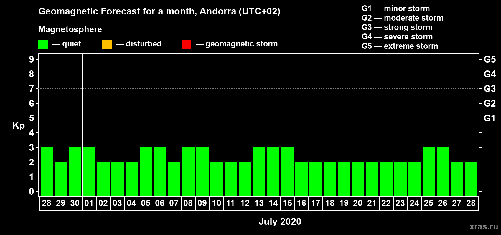 Geomagnetic storm forecast in Andorra for Jun 28, 2020
