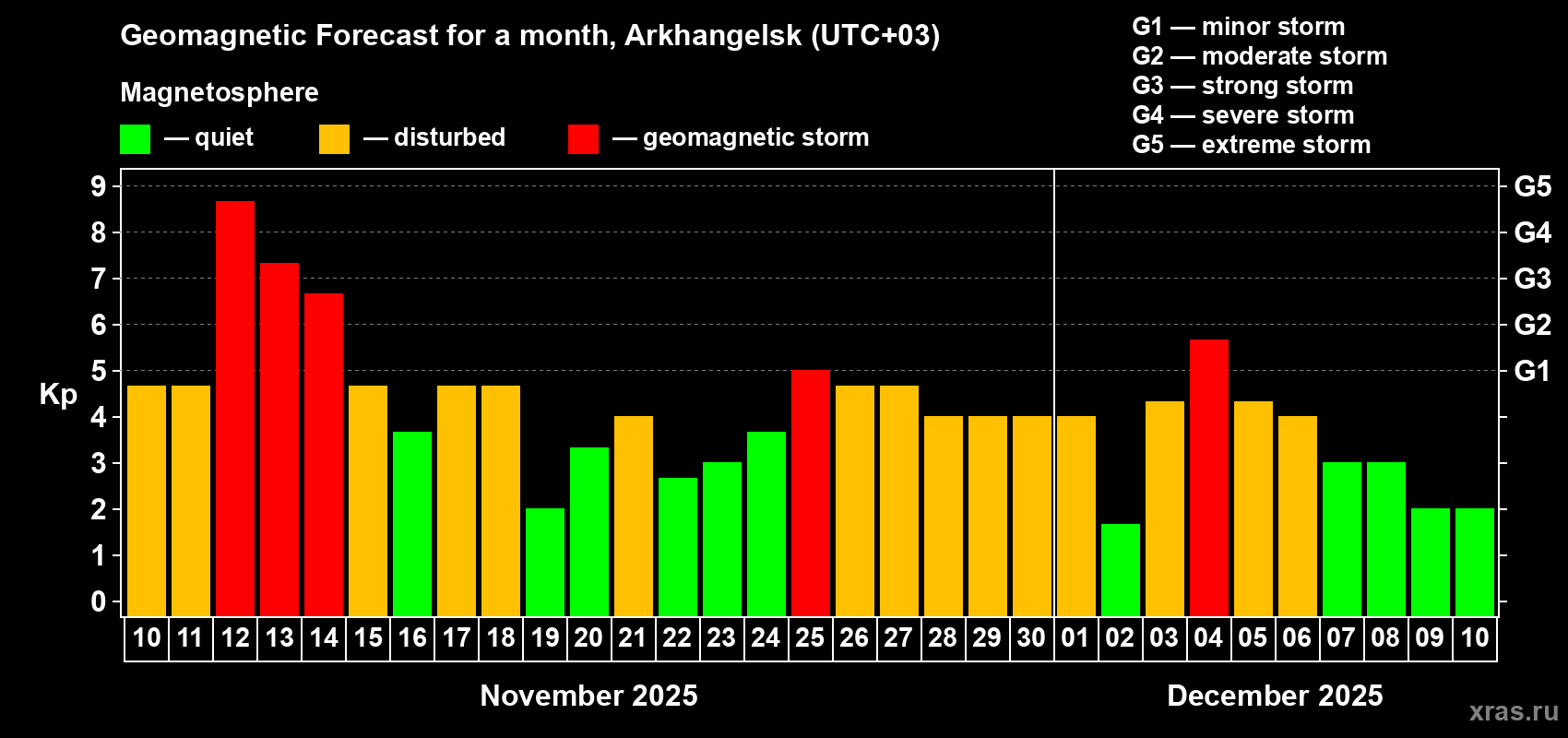 Geomagnetic storm forecast in Arkhangelsk for Nov 10, 2025
