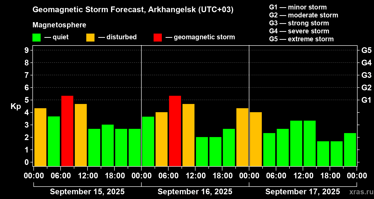Geomagnetic storm forecast in Arkhangelsk for Sep 15, 2025
