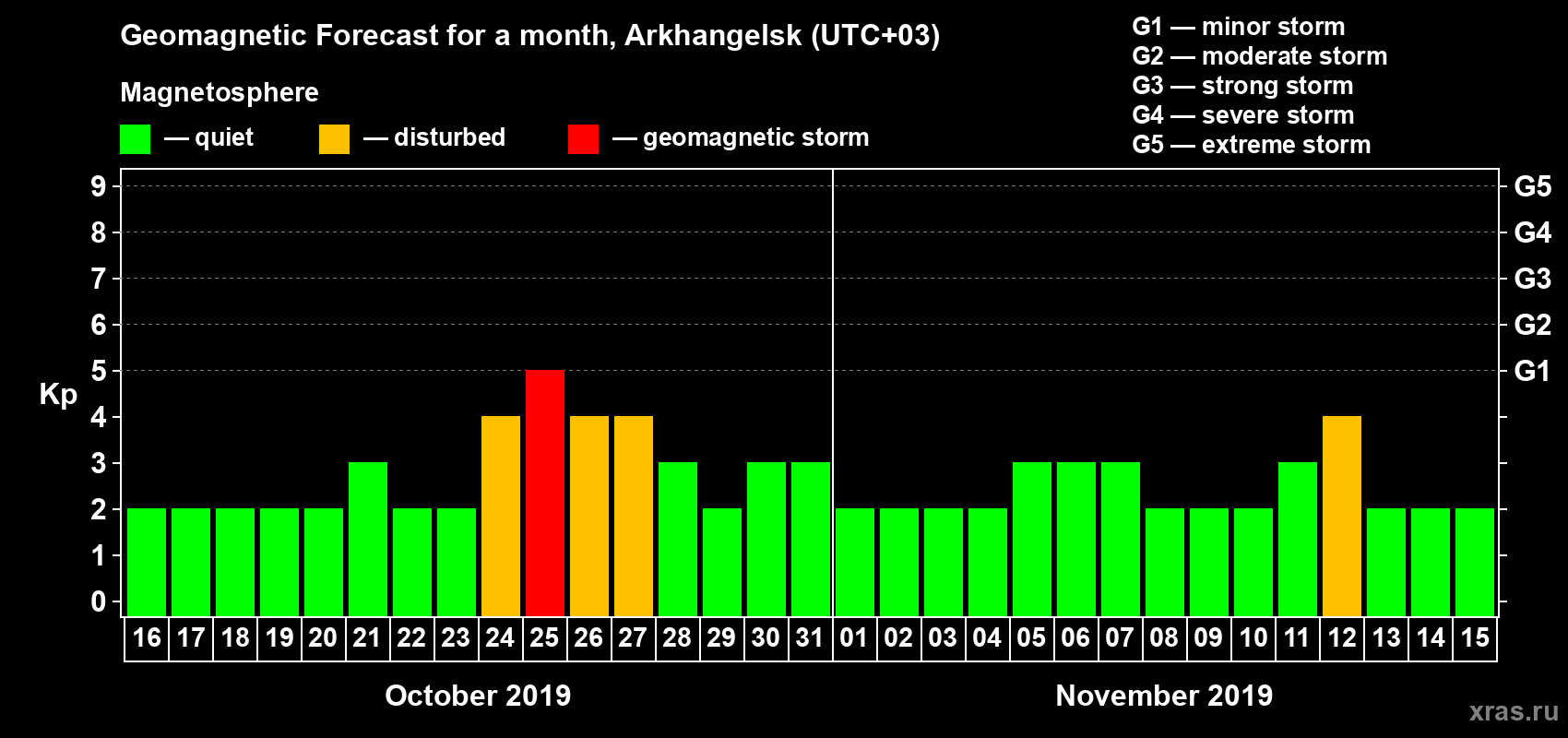 Geomagnetic storm forecast in Arkhangelsk for Oct 16, 2019