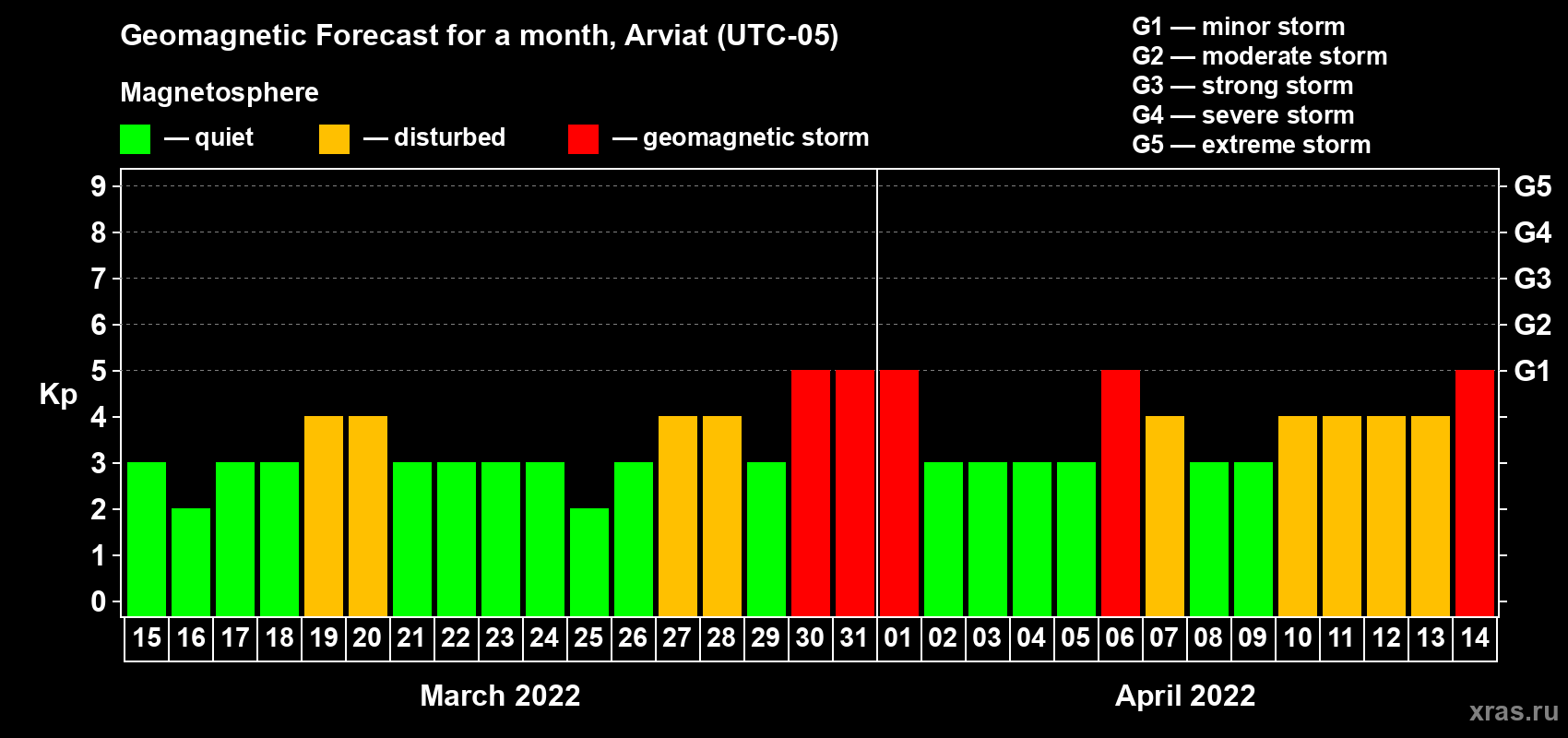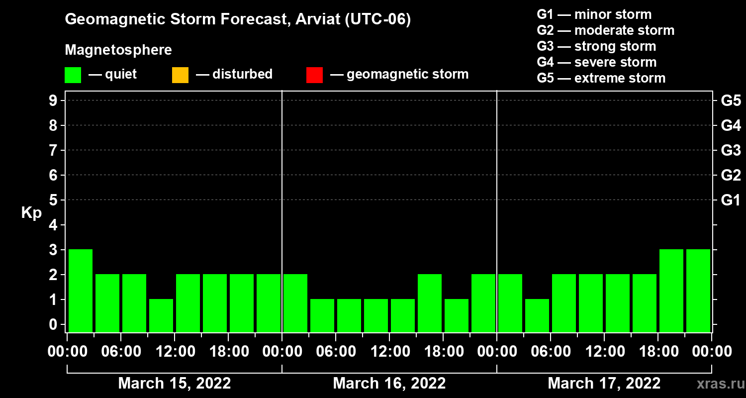 Geomagnetic storm forecast in Arviat for Mar 15, 2022