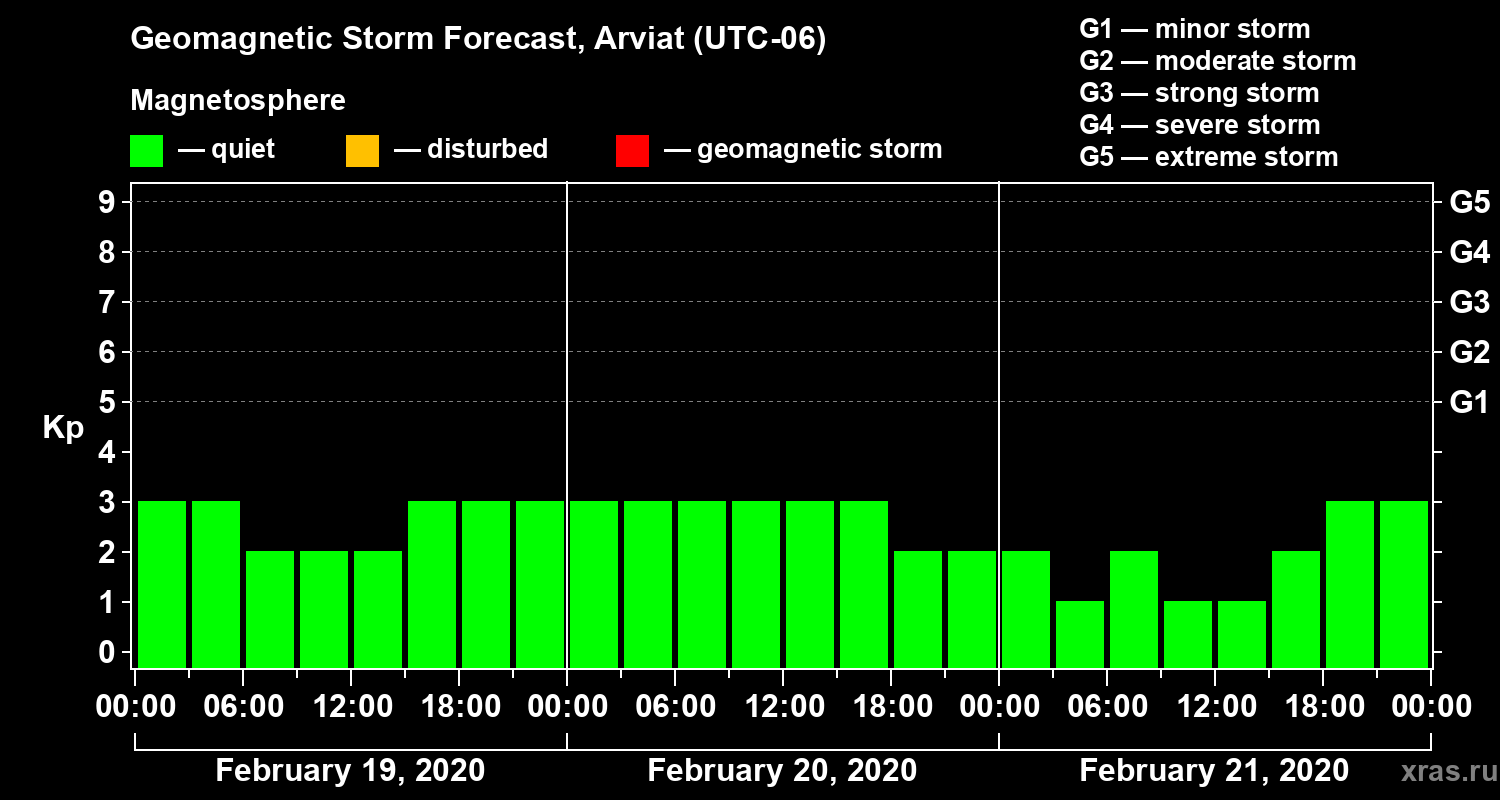 Geomagnetic storm forecast in Arviat for Feb 19, 2020
