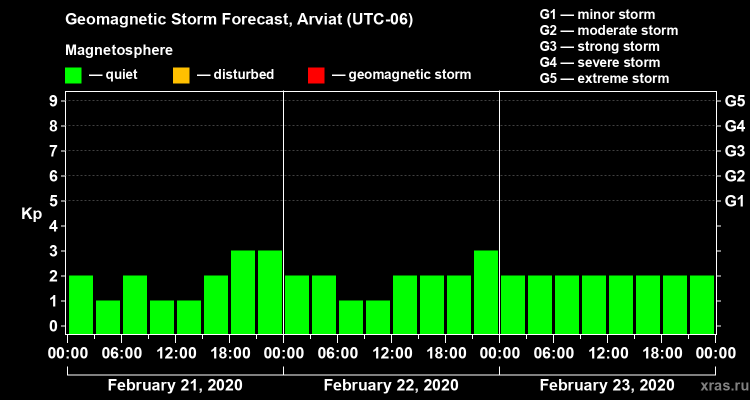 Geomagnetic storm forecast in Arviat for Feb 21, 2020