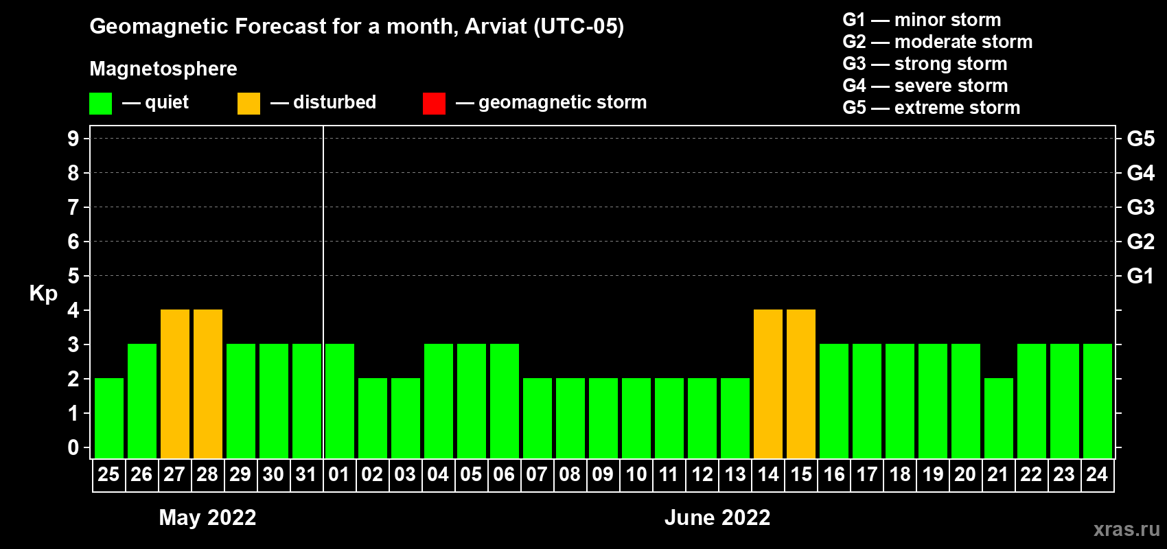 Geomagnetic storm forecast in Arviat for May 25, 2022