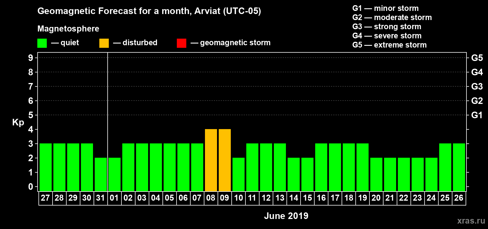 Geomagnetic storm forecast in Arviat for May 27, 2019