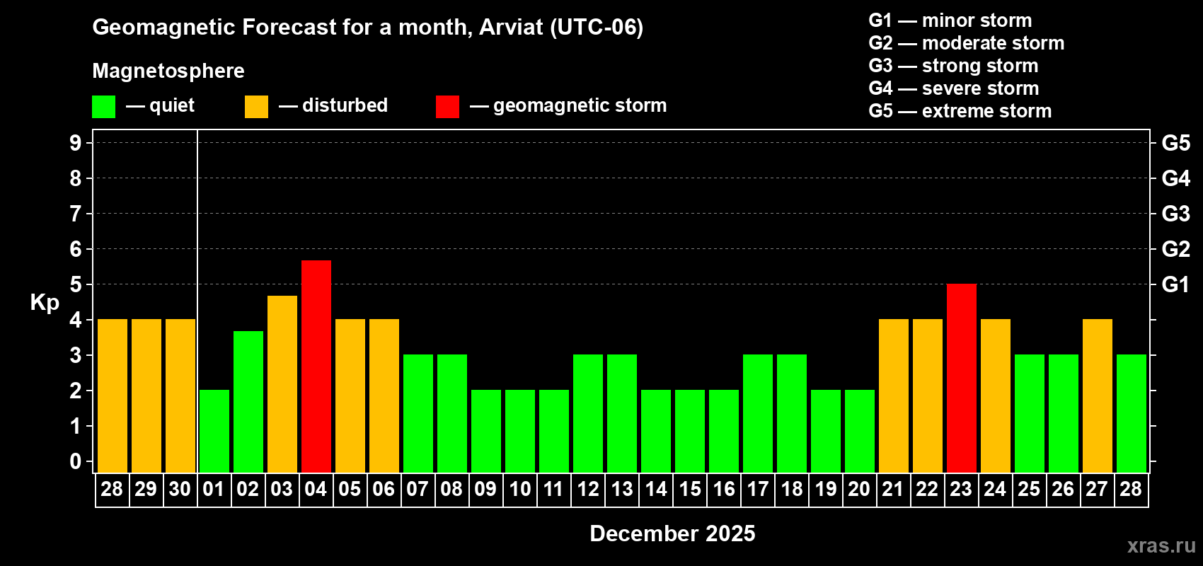 Geomagnetic storm forecast in Arviat for Nov 28, 2025