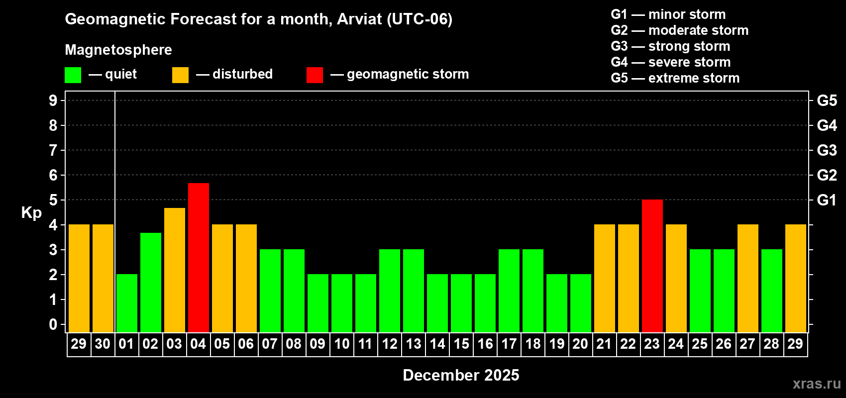 Geomagnetic storm forecast in Arviat for Nov 29, 2025