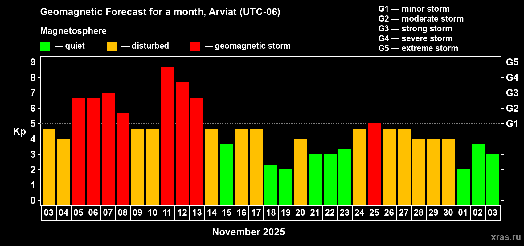 Geomagnetic storm forecast in Arviat for Nov 03, 2025