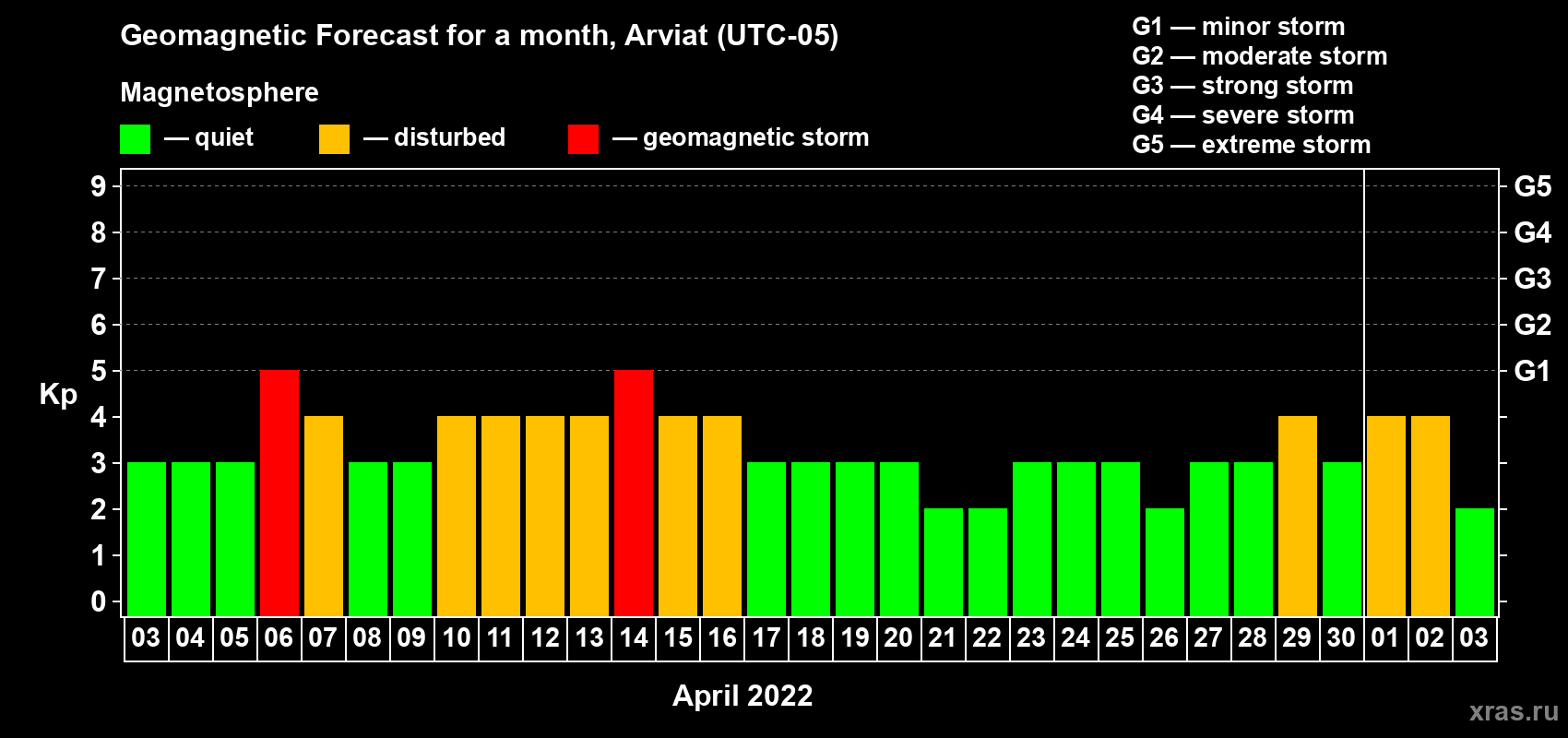 Geomagnetic storm forecast in Arviat for Apr 03, 2022