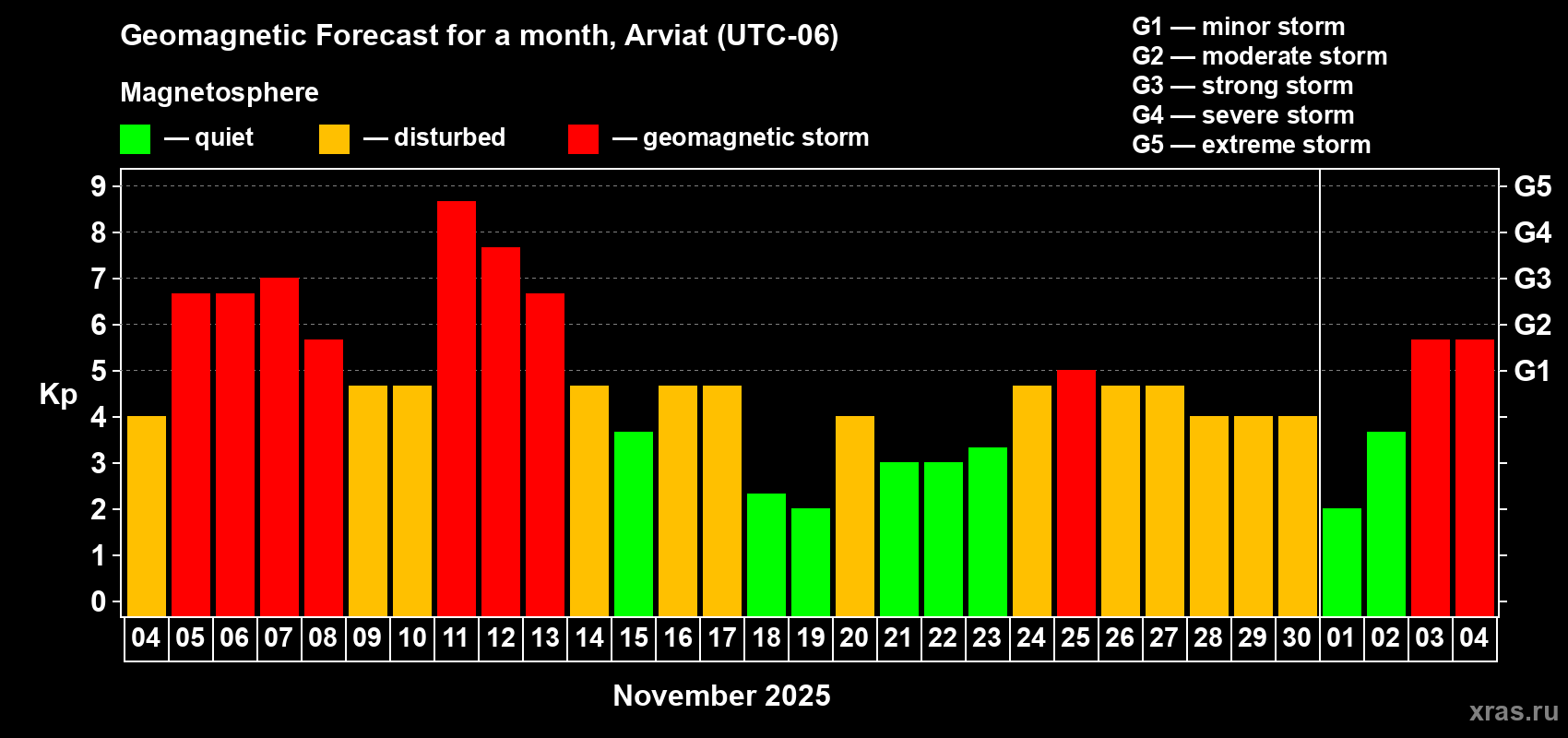 Geomagnetic storm forecast in Arviat for Nov 04, 2025