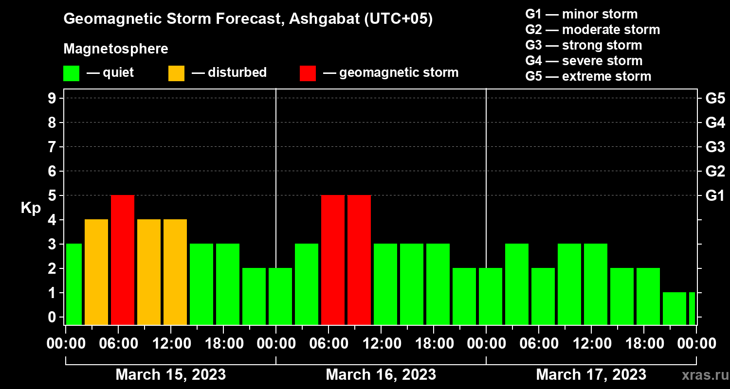Geomagnetic storm forecast in Ashgabat for Mar 15, 2023