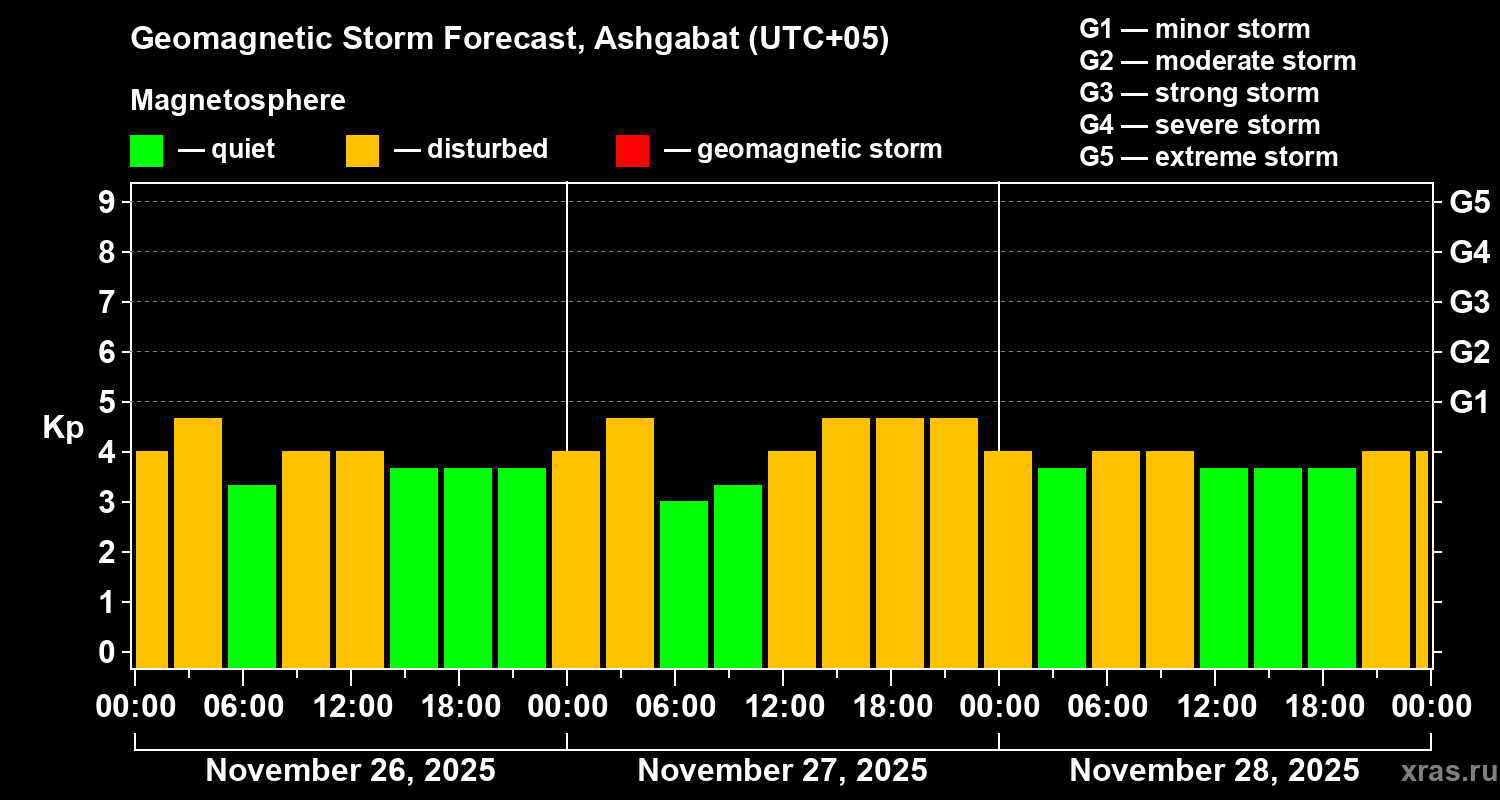 Geomagnetic storm forecast in Ashgabat for Nov 26, 2025