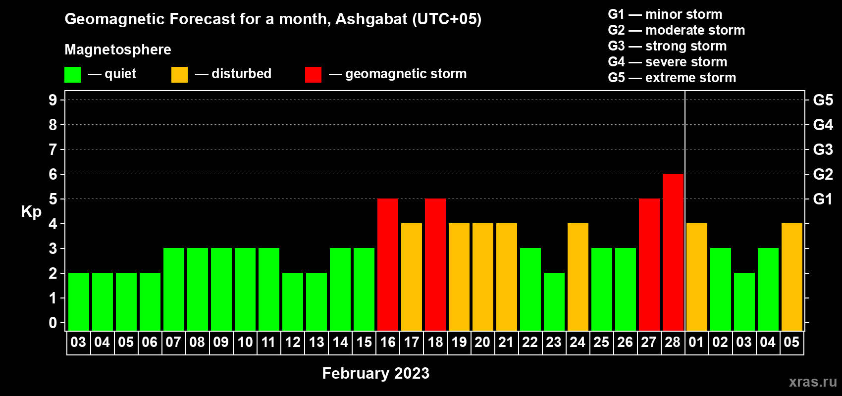 Geomagnetic storm forecast in Ashgabat for Feb 03, 2023