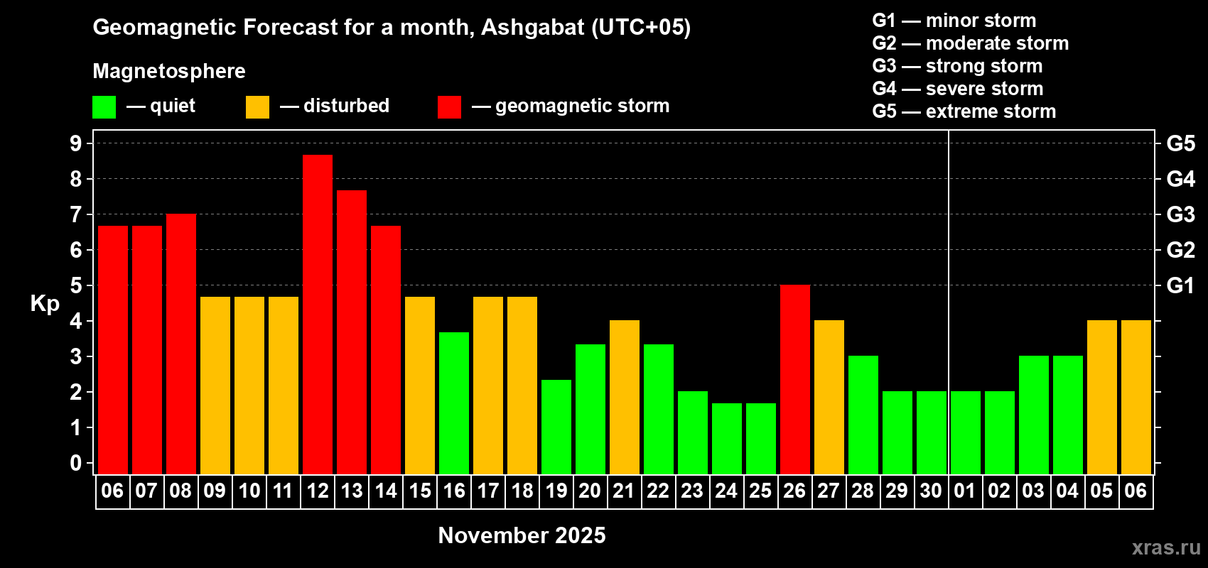 Geomagnetic storm forecast in Ashgabat for Nov 06, 2025