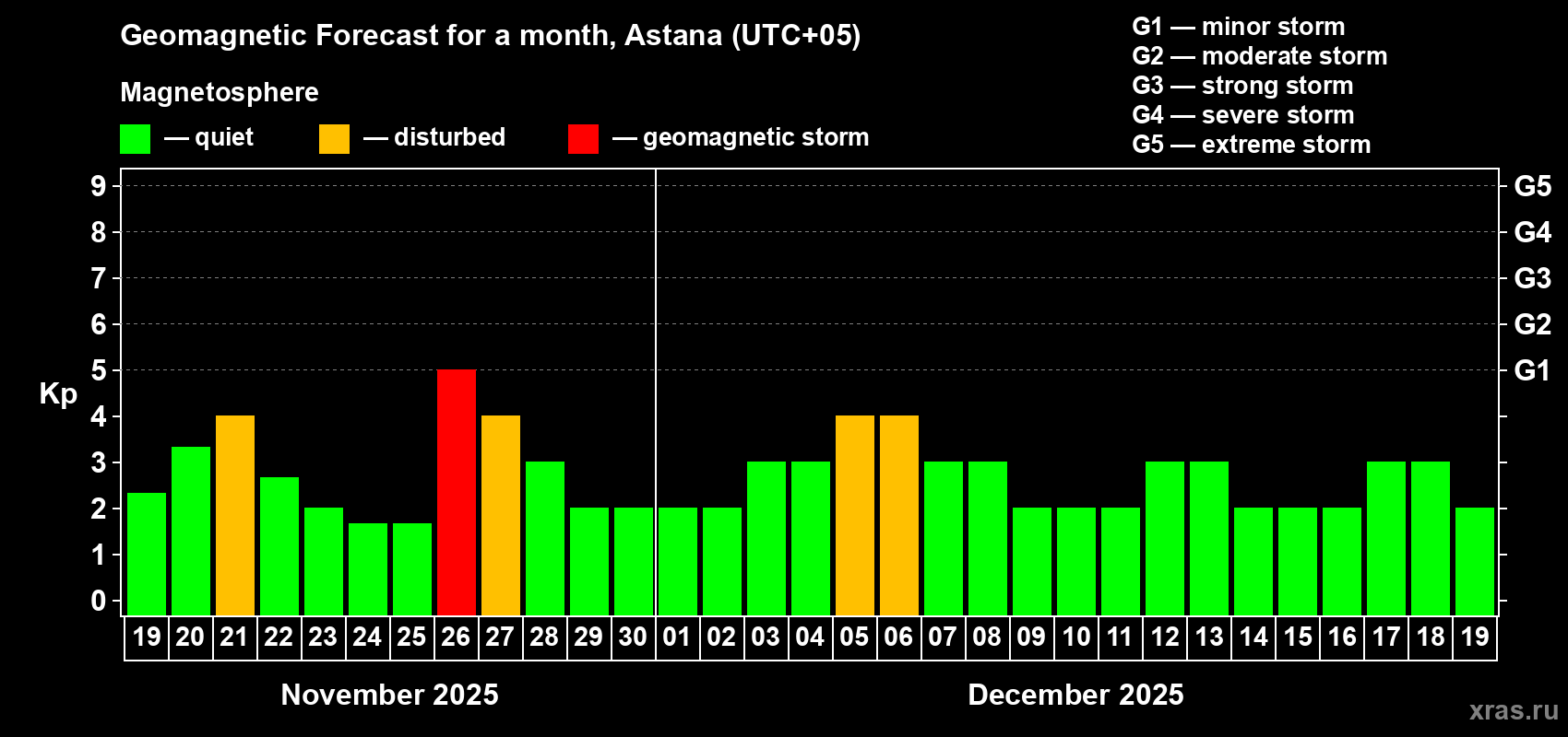 Geomagnetic storm forecast in Astana for Nov 19, 2025