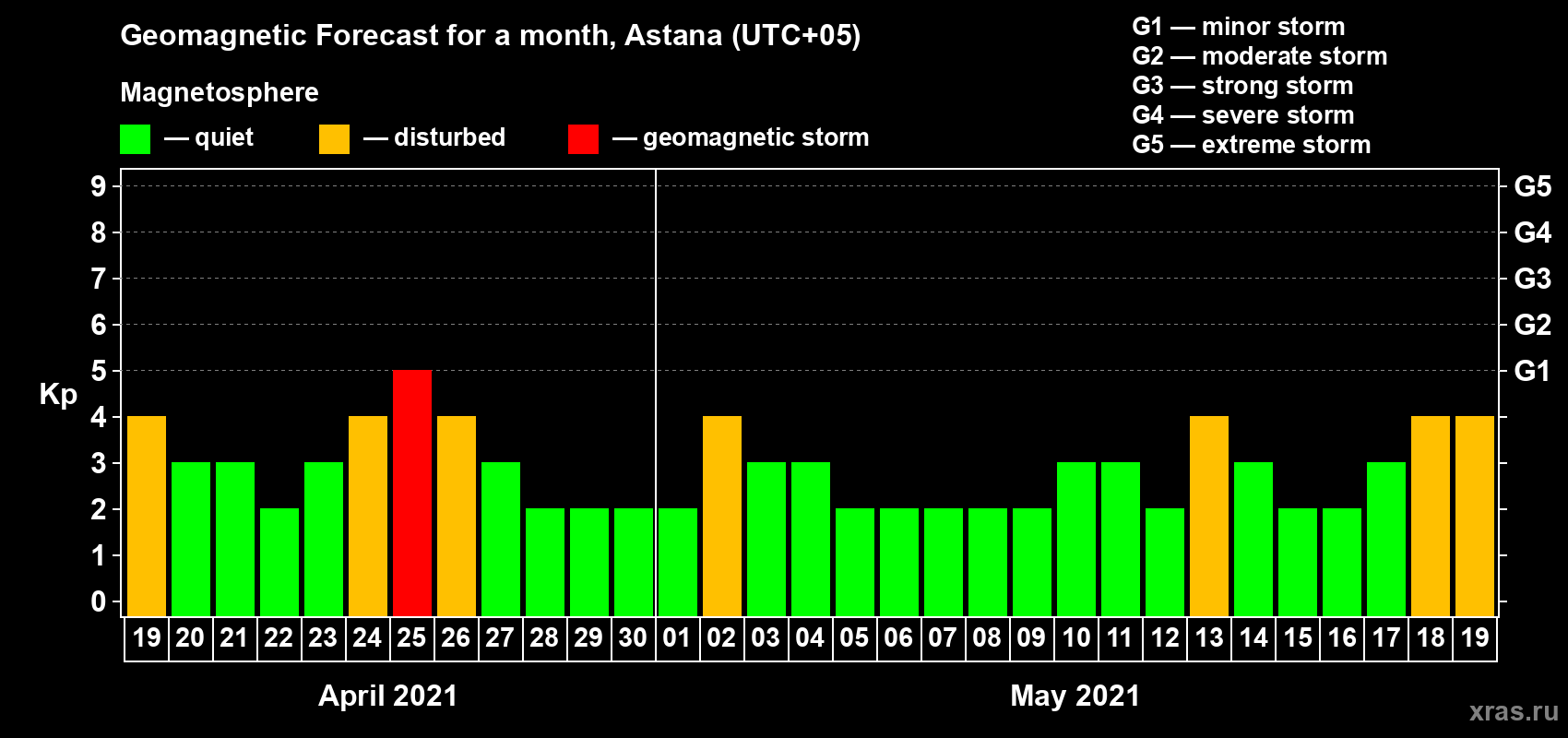 Geomagnetic storm forecast in Astana for Apr 19, 2021