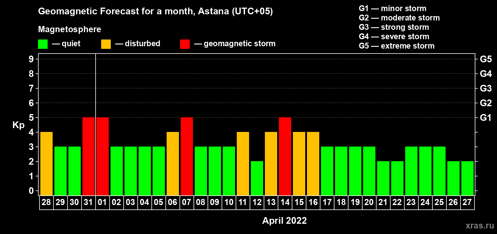 Geomagnetic storm forecast in Astana for Mar 28, 2022