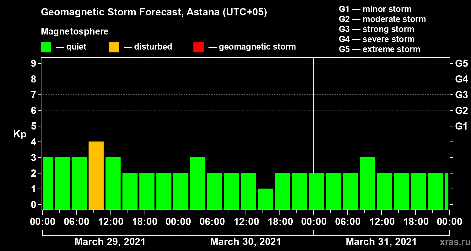 Geomagnetic storm forecast in Astana for Mar 29, 2021