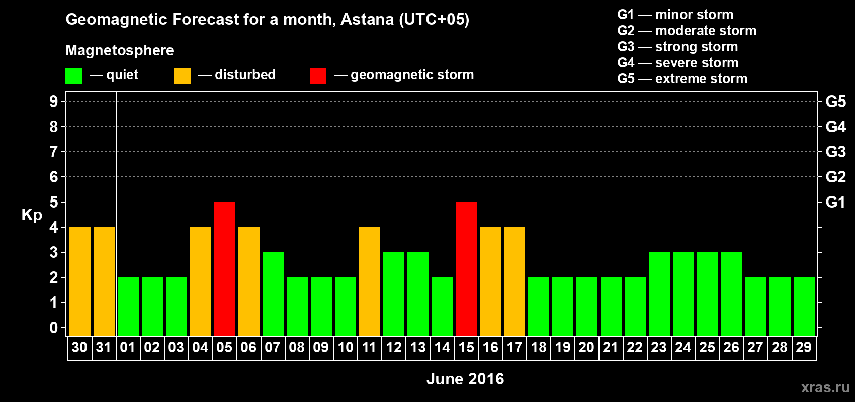 Geomagnetic storm forecast in Astana for May 30, 2016