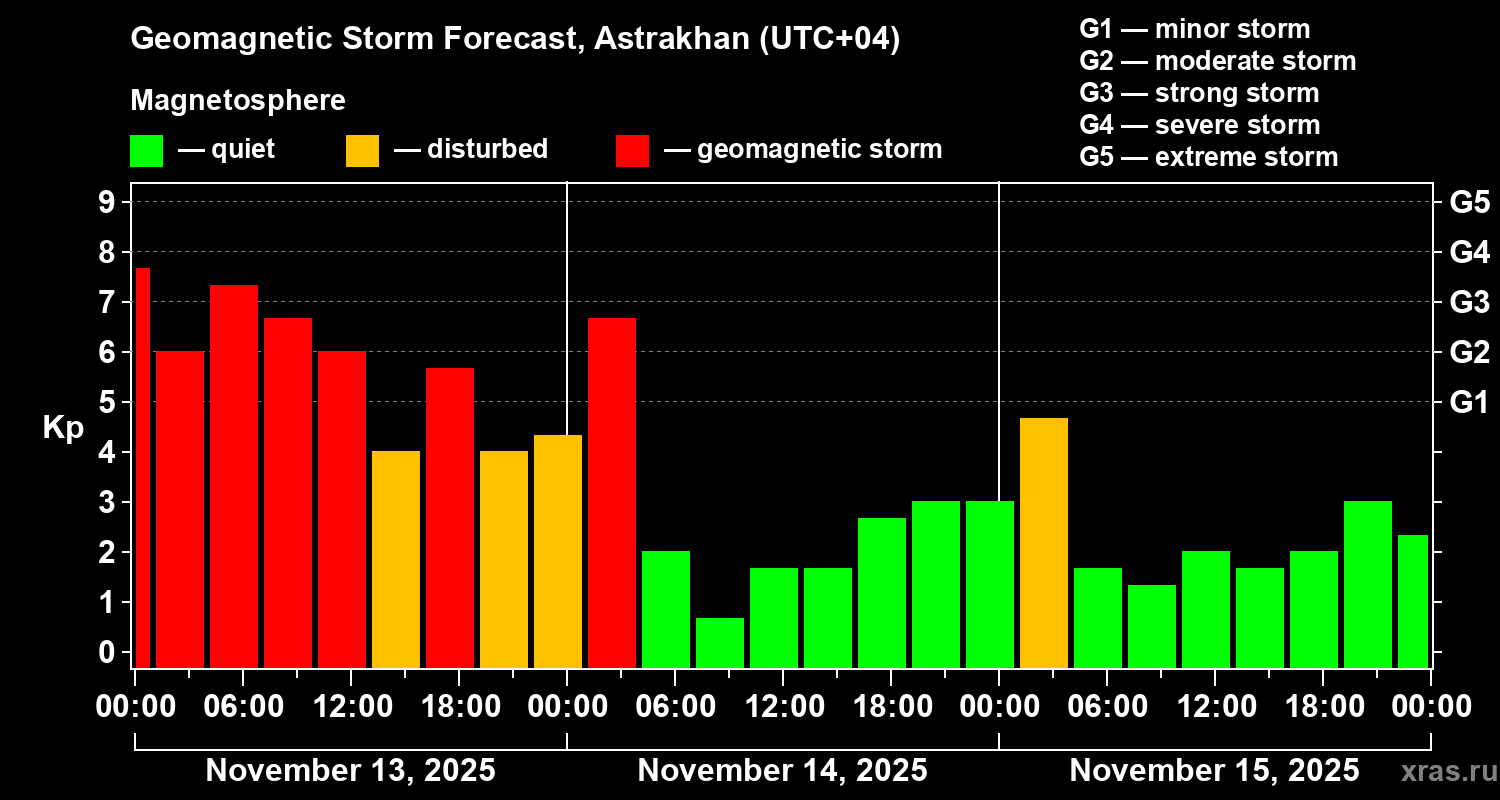 Geomagnetic storm forecast in Astrakhan for Nov 13, 2025