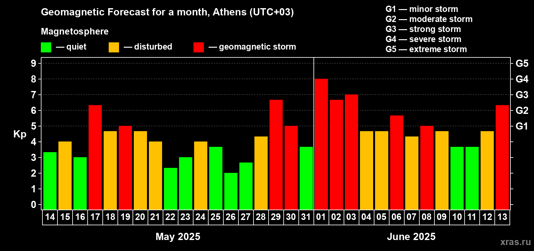 Geomagnetic storm forecast in Athens for May 14, 2025