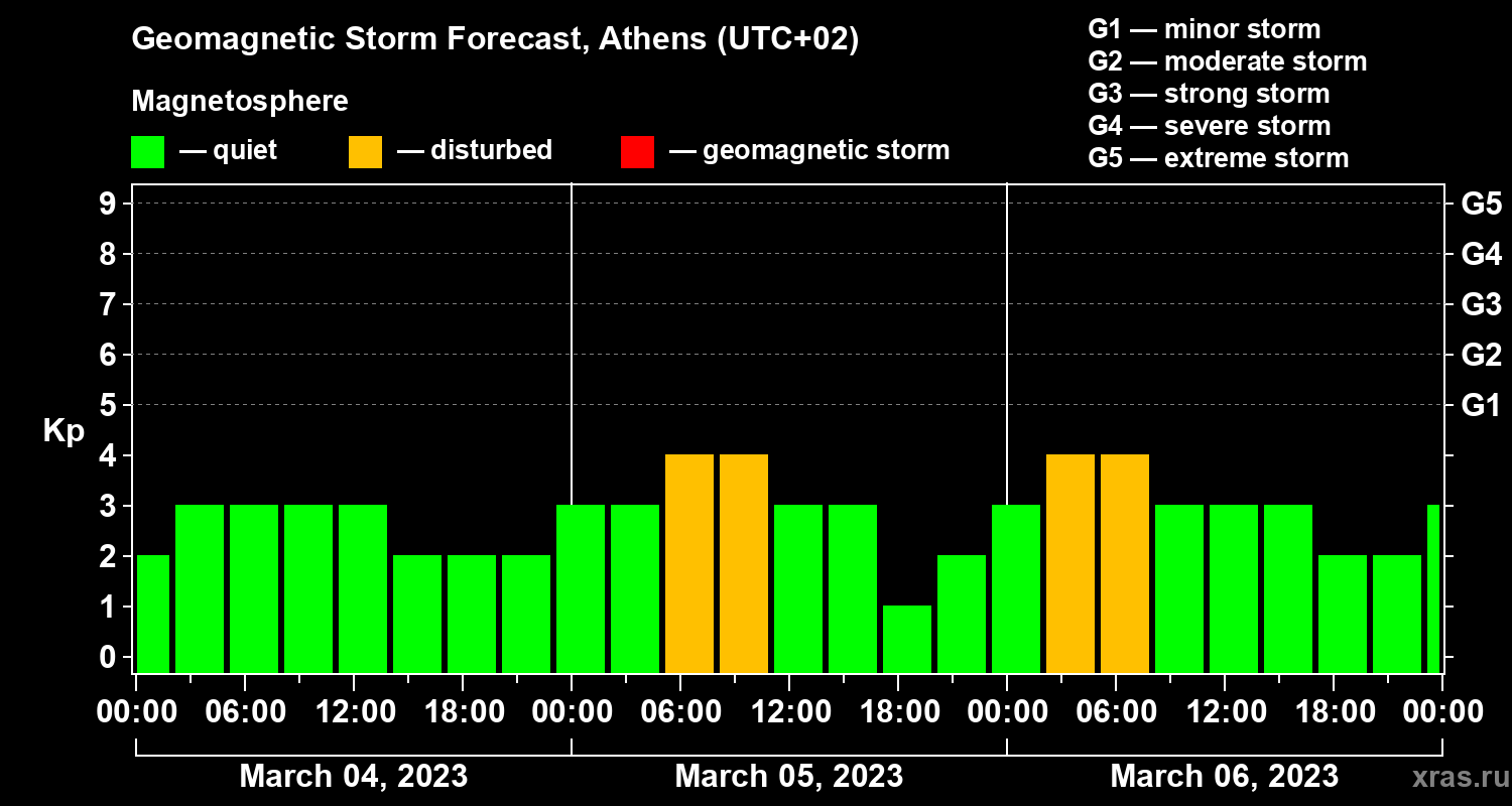Geomagnetic storm forecast in Athens for Mar 04, 2023