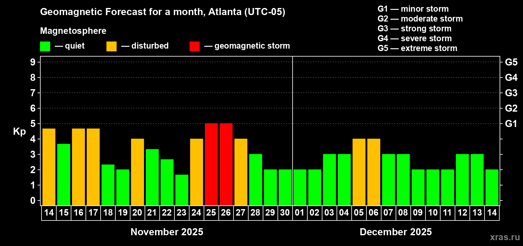 Geomagnetic storm forecast in Atlanta for Nov 14, 2025