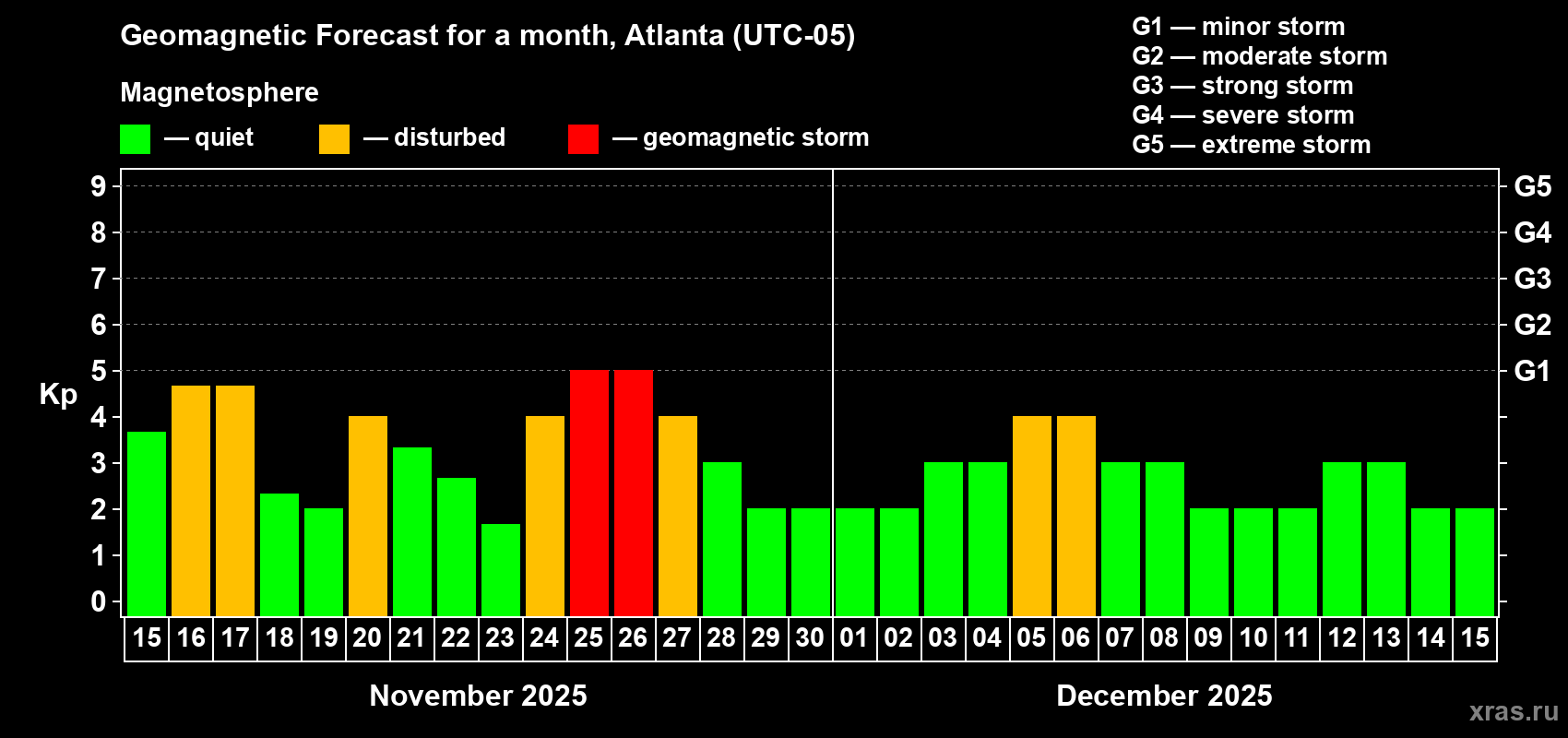 Geomagnetic storm forecast in Atlanta for Nov 15, 2025